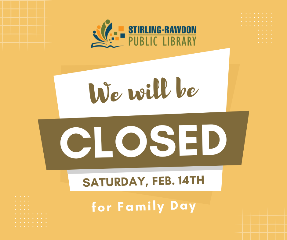 The Stirling-Rawdon Public Library will be closed Saturday, February 14th for Family Day. Normal hours resume Tuesday, February 17th