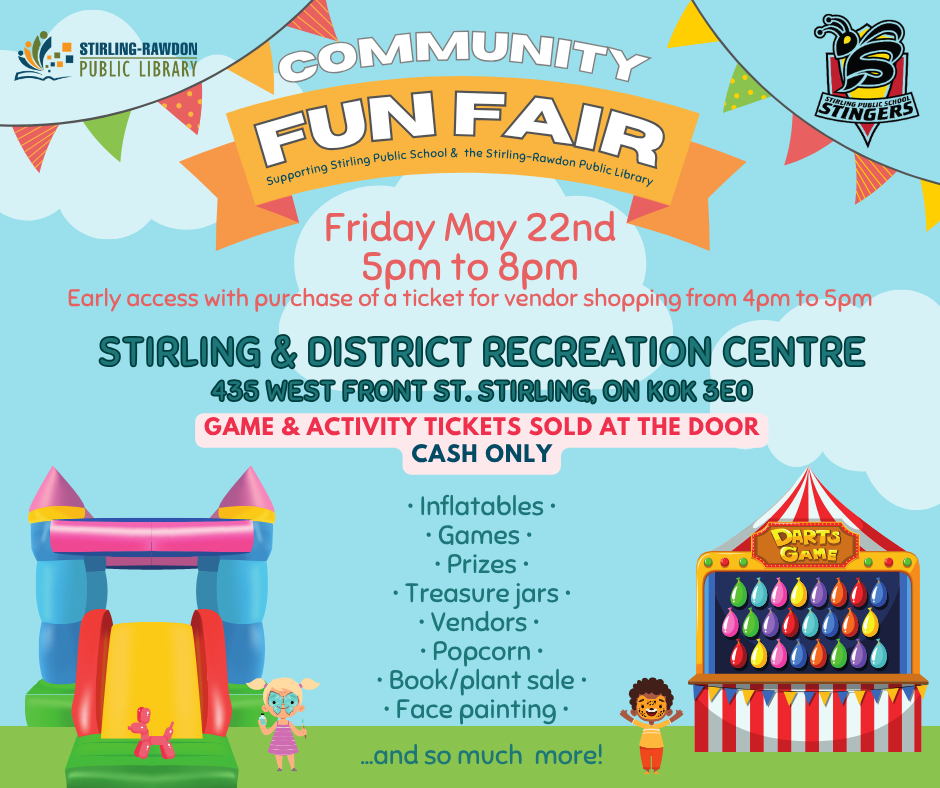 Who’s looking forward to the Community Fun Fair happening Friday, May 22nd? Mark your calendars because it’s going to be a lot of fun! Proceeds raised from the Fun Fair help support Stirling Public School and the Stirling-Rawdon Public Library so we hope to see you all there!