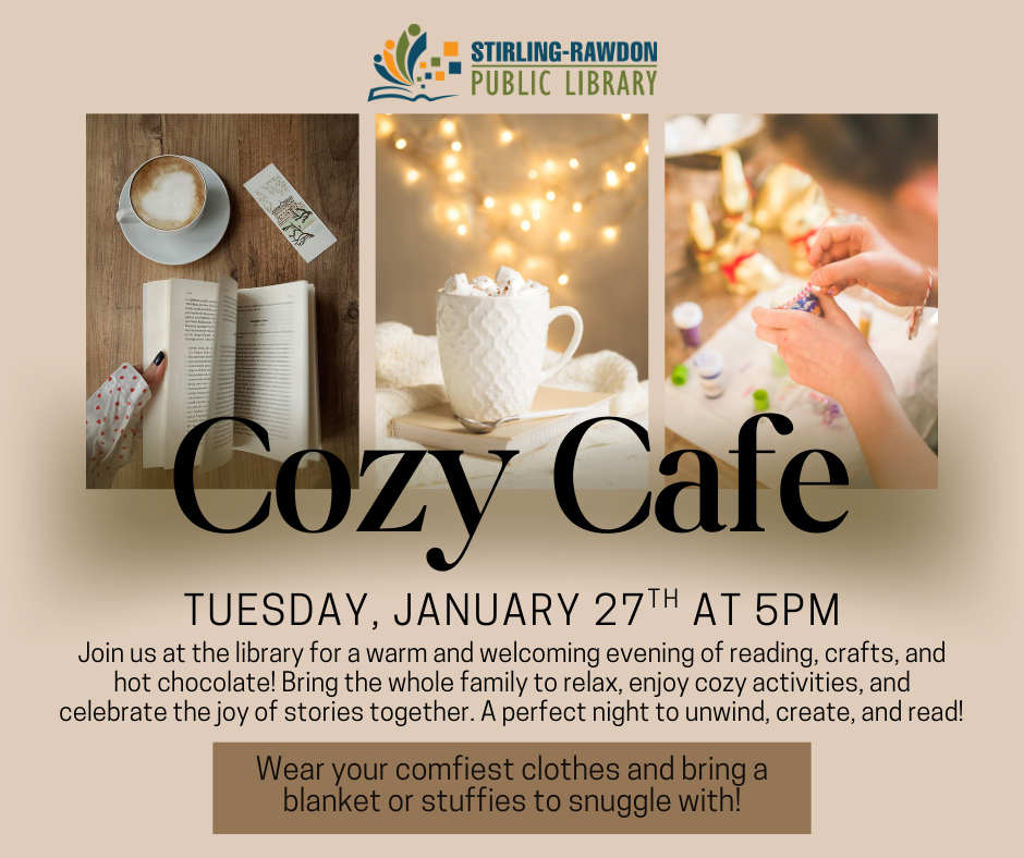 Join us at the library for a warm and welcoming evening of reading, crafts, and hot chocolate! Bring the whole family to relax, enjoy cozy activities, and celebrate the joy of stories together. A perfect night to unwind, create, and read! Wear your comfiest clothes and bring a blanket or stuffies to snuggle with! No registration required. Tuesday, January 27th at 5pm