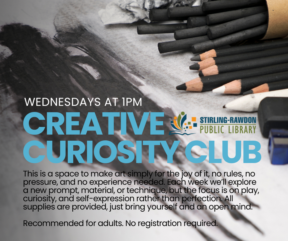 In December we’re exploring charcoal! Join us to make art simply for the fun of it. The important thing is the act of creating and not the final product so no experience necessary and all you need to bring is an open mind! No registration required. Wednesdays at 1pm, for adults.