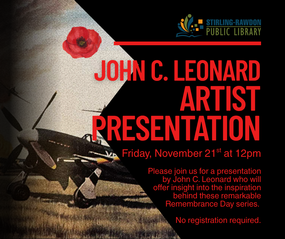 Please join us on Friday, November 21st at 12pm at the Stirling-Rawdon Public Library for a presentation by John C. Leonard who will offer insight into the inspiration behind these remarkable Remembrance Day series. No registration required.