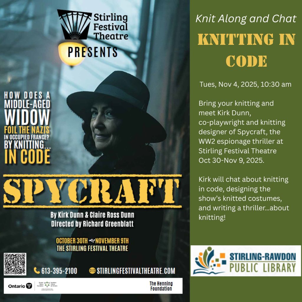 Bring your knitting, or just come and chat, and meet Kirk Dunn, co-playwright and knitting designer of Spycraft, the WW2 espionage thriller at the Stirling Festival Theatre Oct. 30th to Nov. 9th, 2025. Kirk will chat about knitting in code, designing the show’s knitted costumes, and writing a thriller…about knitting!