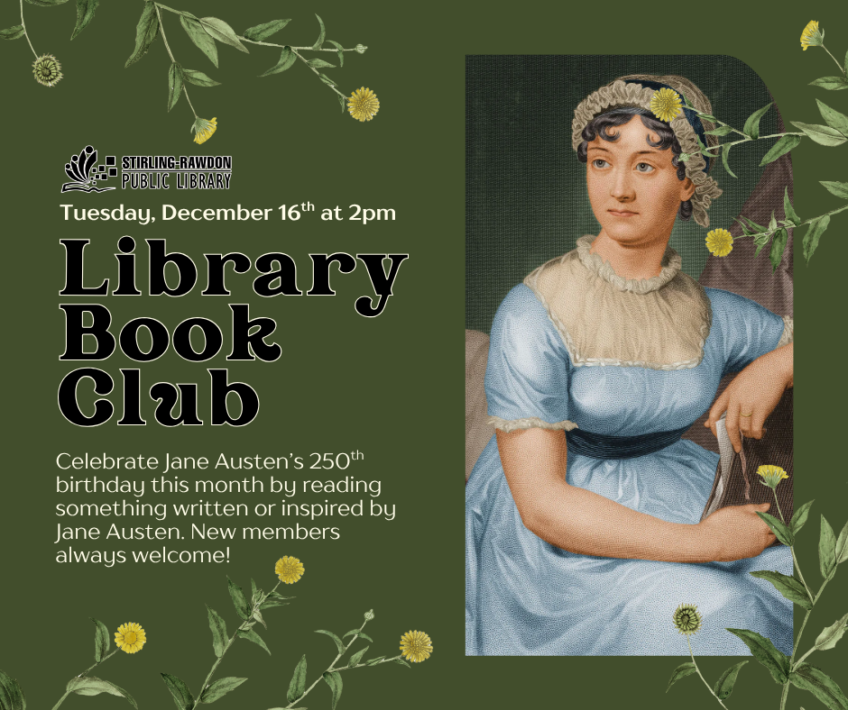 Did you know that Jane Austen’s 250th birthday is December 16th, 2025? To celebrate our theme for December is all things Jane Austen! Read one of her books or something inspired by Jane Austen and at our meeting, we’ll share what we read. It’s all about connecting over stories, without the pressure of one set reading list. No registration required, new members always welcome.