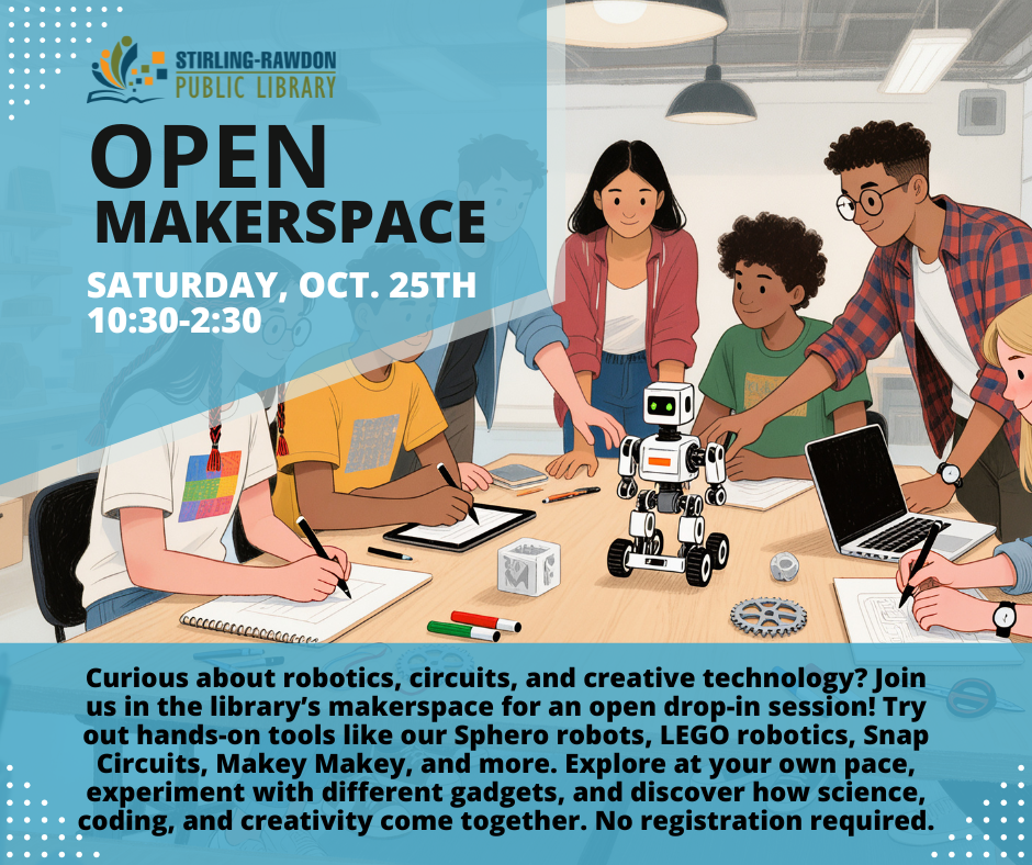 Curious about robotics, circuits, and creative technology? Join us in the library’s makerspace for an open drop-in session! Saturday, October 25th drop-in any time between 10:30am and 2:30pm. Try out hands-on tools like our Sphero robots, LEGO robotics, Snap Circuits, Makey Makey, and more. Explore at your own pace, experiment with different gadgets, and discover how science, coding, and creativity come together. No registration required.